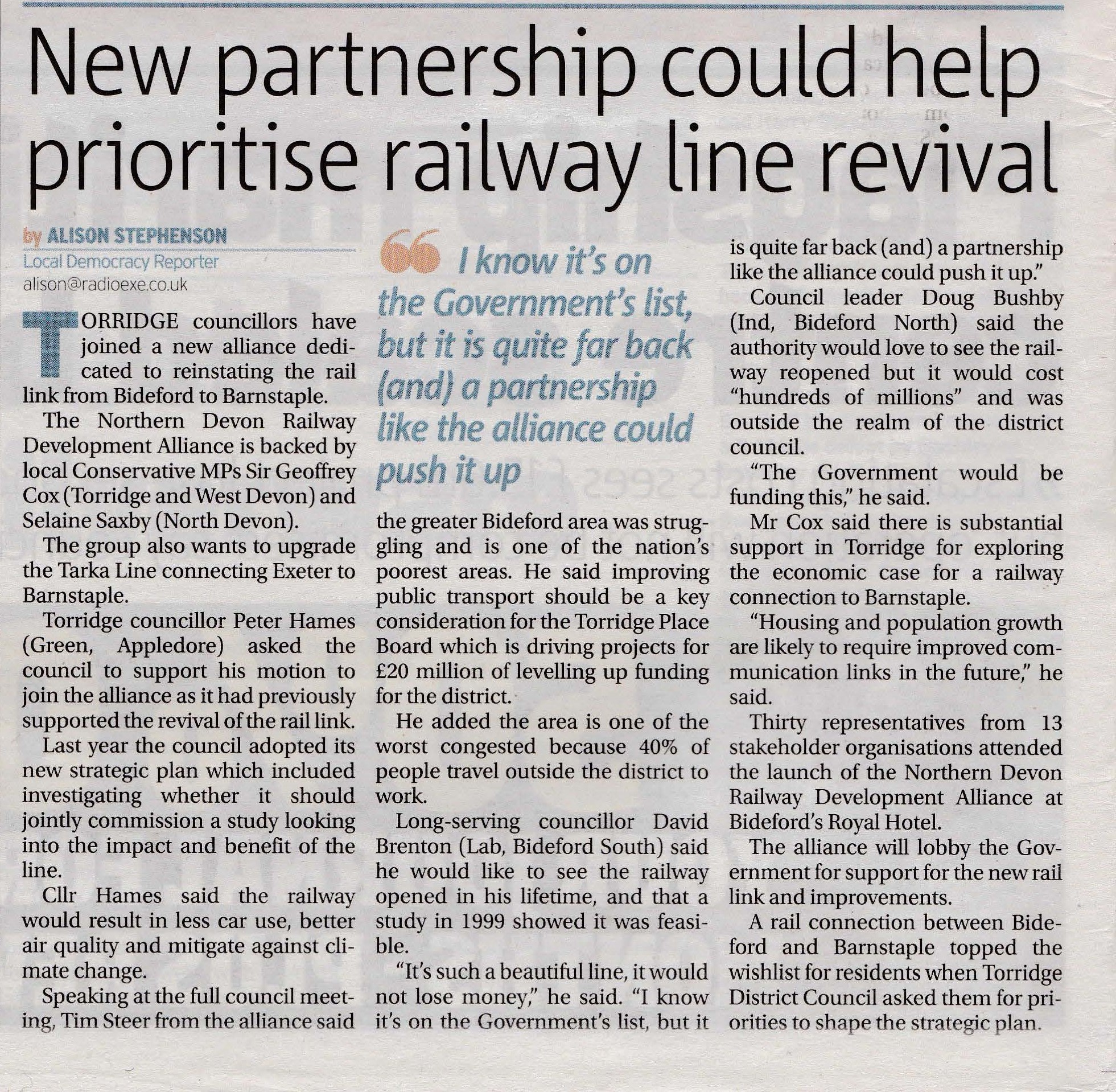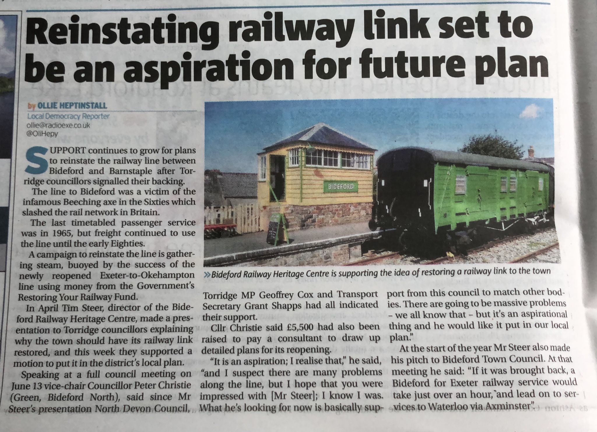 - June - Torridge District Council's Full Council meeting agreed this Motion from Vice-Chair Cllr Peter Christie "That TDC, following on from the presentation made at the last Full council meeting, do support the extension of the railway line from Barnstaple to Bideford and that this aspiration is embedded in the new Joint Local Plan" on the 13th. Deputy Mayor Cllr McKenzie proposed an agreed amendment that the aspiration be added to the economic development plan.