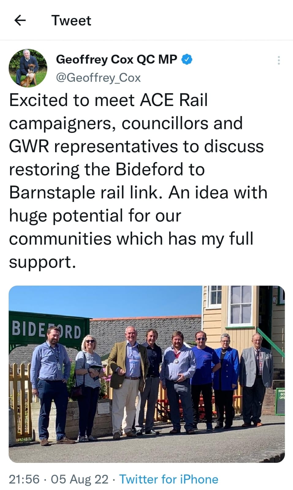 - April - ACE Rail campaign lead Tim Steer received a very supportive letter from the MP for Torridge & West Devon Sir Geoffrey Cox, on the 14th, indicating that he has asked the Transport Secretary for advice on how the scheme might be taken forward.