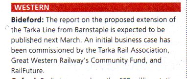 - March - Tarka team on target for Bideford reports the April issue of Railwatch, house magazine of Railfuture, published mid-March.