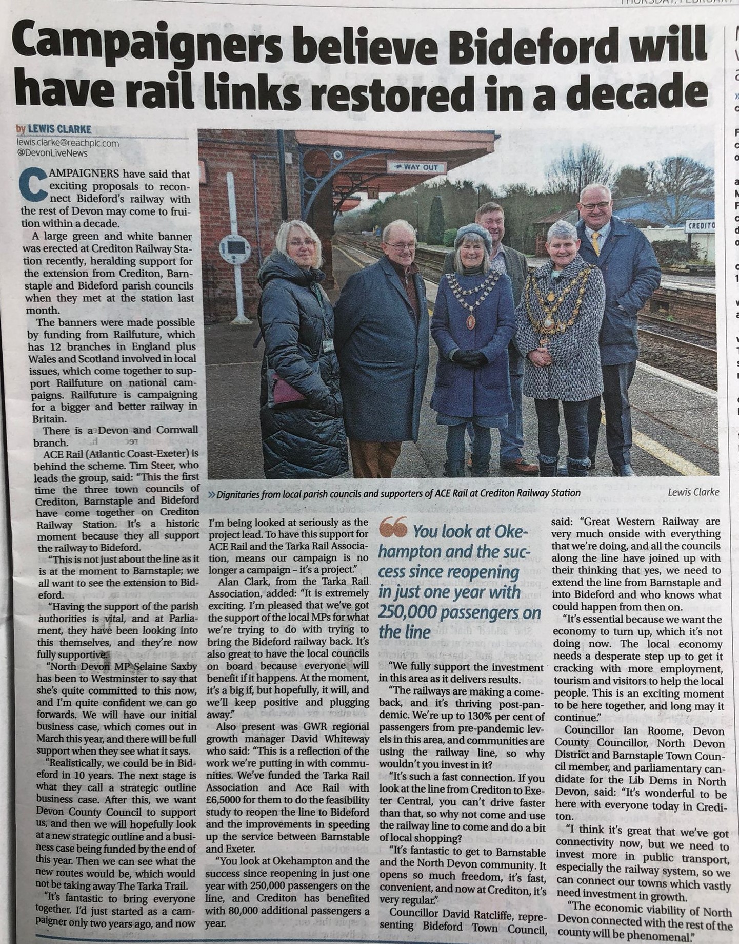 - February - Motion to Tawstock Parish Council on the 15th, confirmed in Minute 186: It was agreed to support the re-instatement of Bideford to Barnstaple rail link for passenger and other services, as proposed by ACE Rail and include the policy aim within the revised joint local plan.