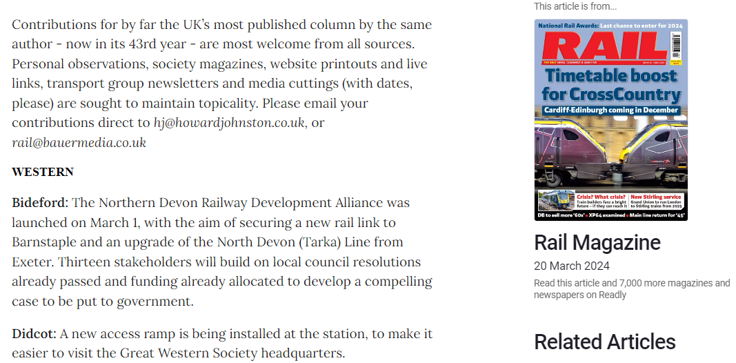 - March - "‘Dear rail minister, we could be forgiven for losing hope’" is the headline over the full-page report, with "Dismay of Tarka Line passengers" heading a side column in the North Devon Gazette (online subscriber edition), on the 4th. Ken Miles, Chief Executive of North Devon Council, told the Gazette that the Council has now formally resolved to join the Northern Devon Railway Development Alliance (instigated by Railfuture in late-2023).