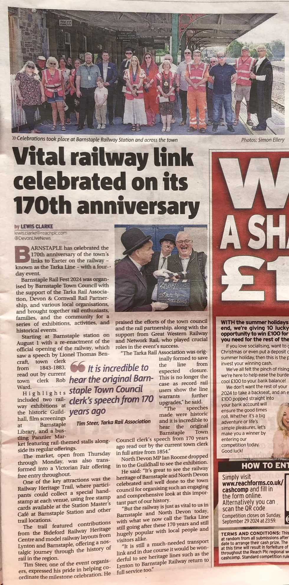 - September - "'Huge problem' as urgent plea sounded over busy railway - People have had their say" reports Devon Live as on the 1st it recalls last month's Railway 200 event at the former South Molton Road, now King's Nympton, station. Railfuture’s Devon and Cornwall branch chair, Tim Steer, said the event was not only a celebration but also a serious push for progress. “We need two services per hour and more stops here to serve the community. King's Nympton is a good station with a growing population and deserves better services.”