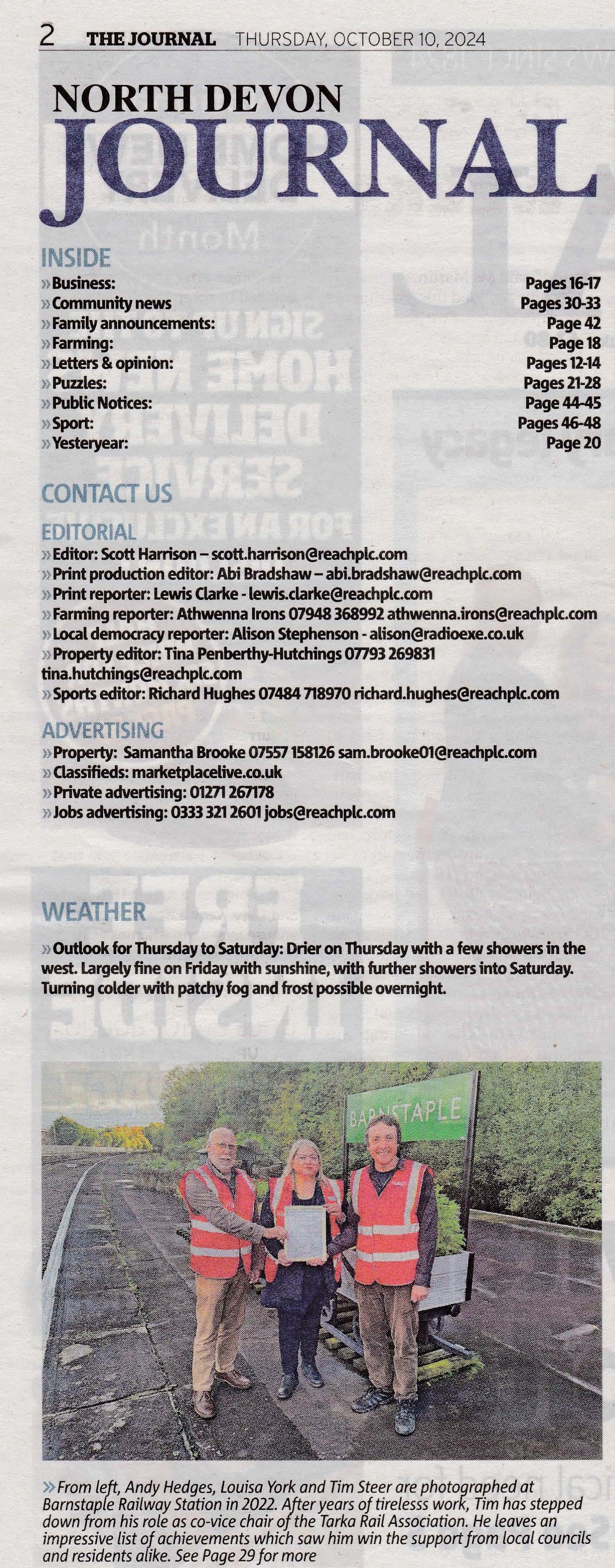 - November - "Petition calls for improved Tarka Line after week-long closure hits passengers" report both North Devon Today and Torbay Weekly, on the 19th. Tim Steer, chair of Railfuture in Devon and Cornwall, said the various issues on the line in recent weeks were due to its ‘Victorian infrastructure’ but overcrowding was also an issue.