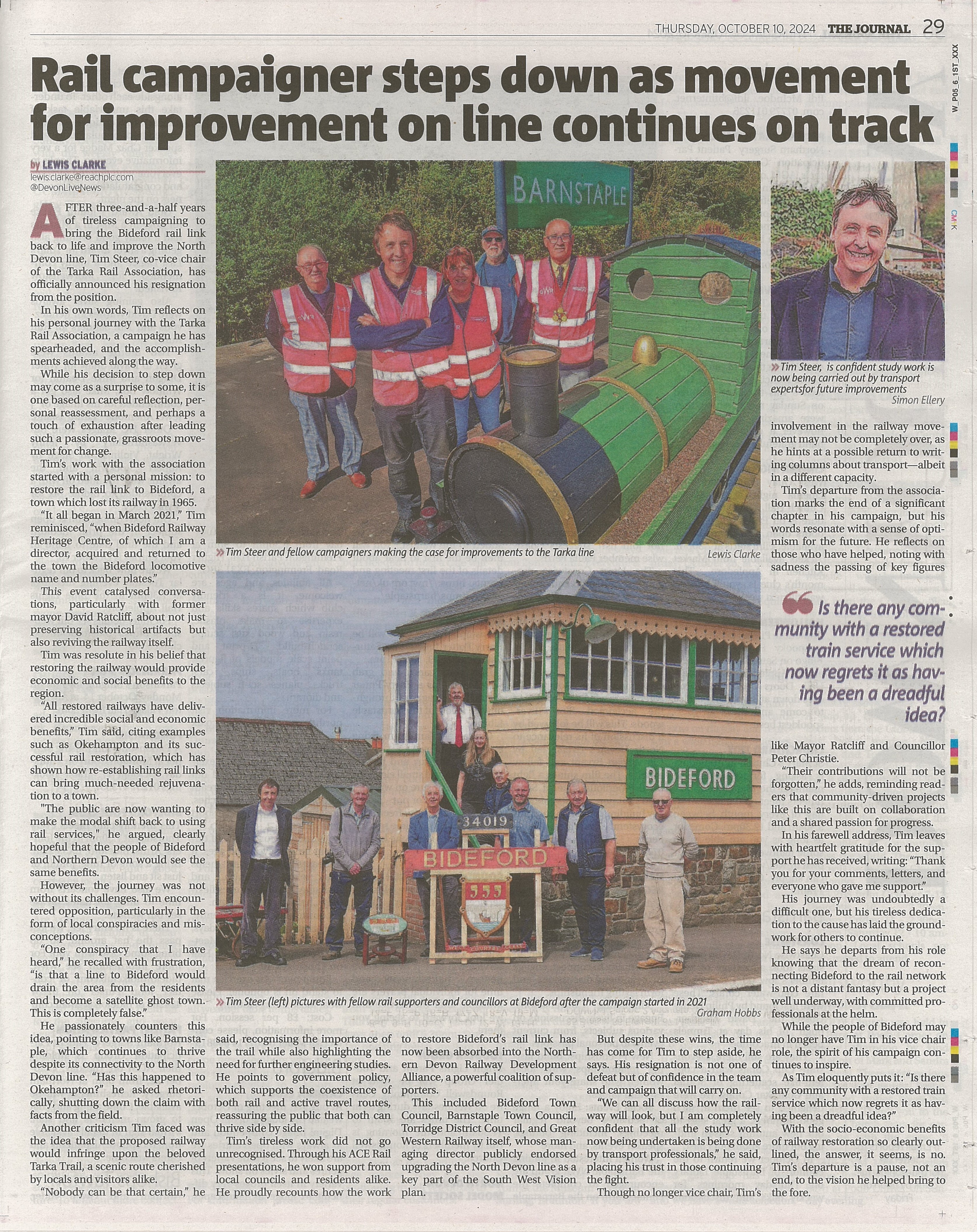 - June - Tarka Rail Association's committee member and its ACE Rail campaign lead, Tim Steer, submits the Association's application to GWR's Customer and Community Improvement Fund for support for an Initial Business Case for ACE Rail - the new Atlantic Coast-Exeter Railway - on the 24th.
