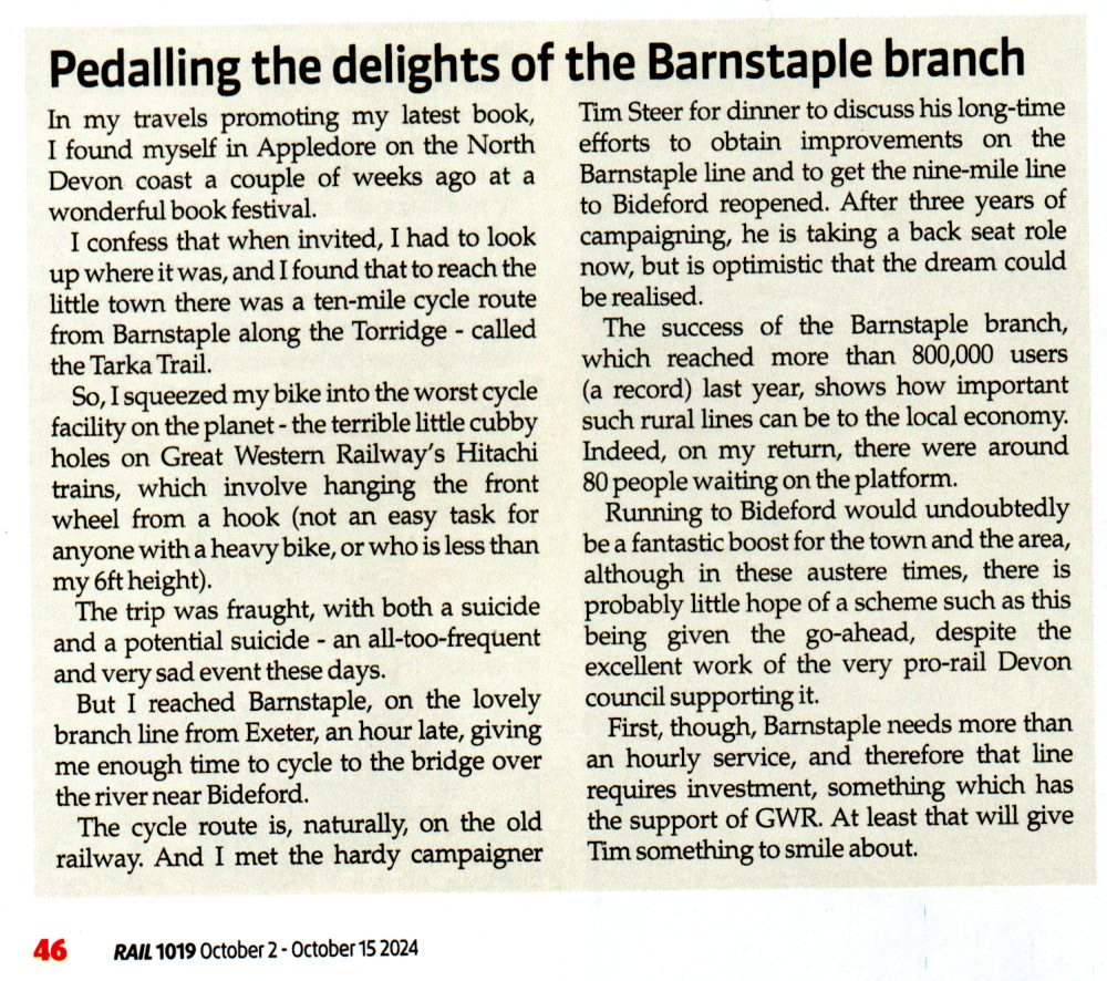 - February issue of Modern Railways - joint letter Back the Bideford bid by Tim Steer (BRHC), Roger Blake (Railfuture), and Kevin Ball (OkeRail).