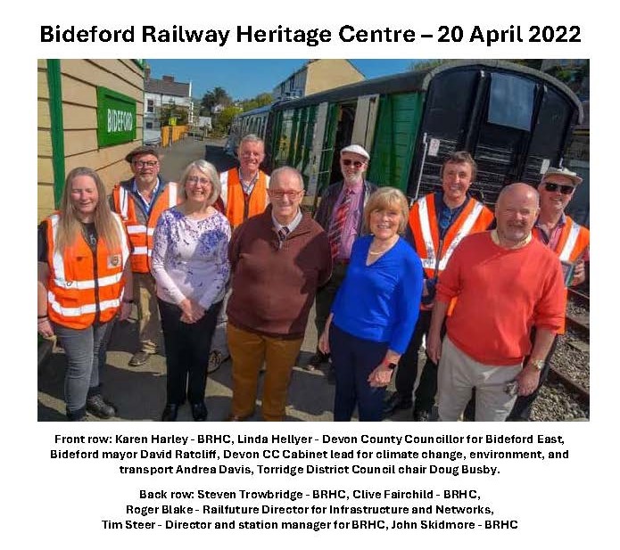 - April - VIPs visit Bideford to see the Railway Heritage Centre and share thoughts on progress with the ACE Rail campaign to reconnect the town's >30k people with the county's economic capital, via a new rail link to Barnstaple and an upgraded Tarka Line for competitive journey times, on the 20th. See group photo: BRHC.