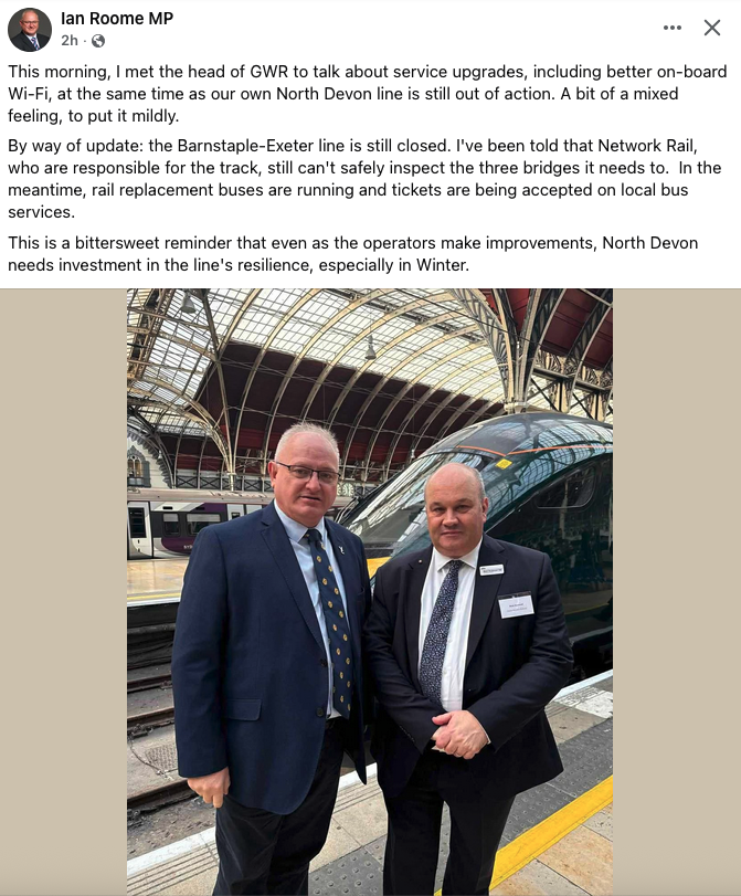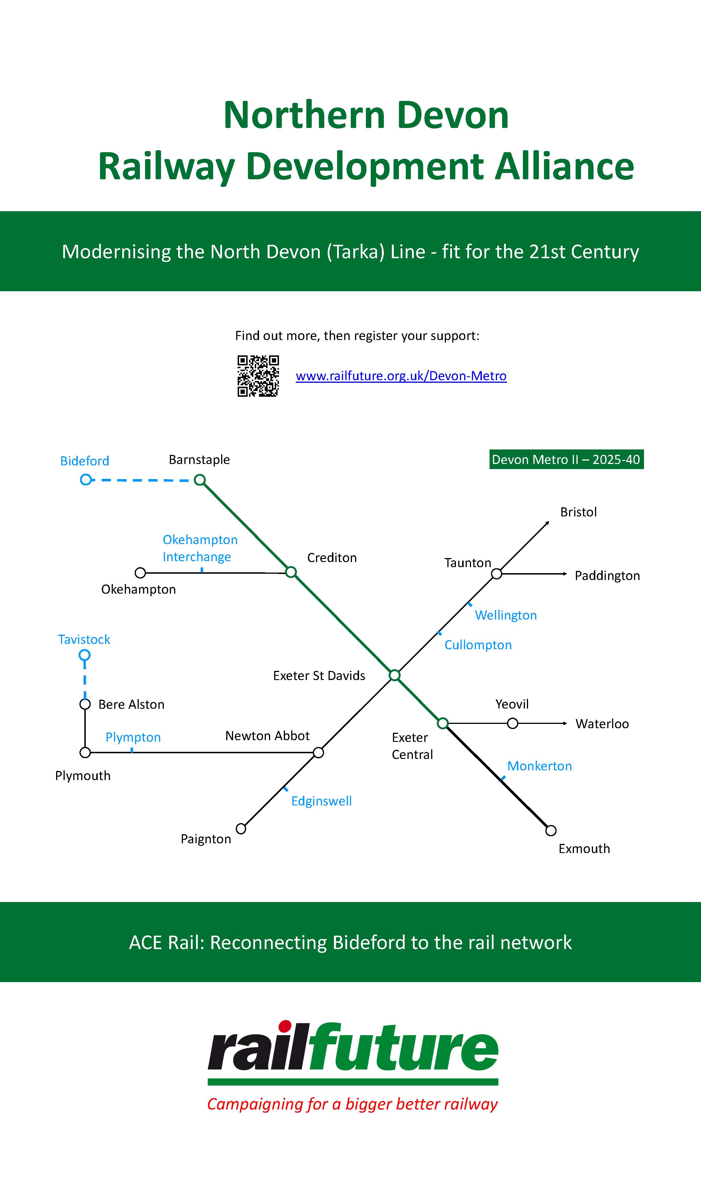 - November - "Future-Proof the Tarka Line!" says Ian Roome MP (North Devon) as he name-checks the Railfuture-instigated Northern Devon Railway Development Alliance in his call to "Back our campaign" by signing his petition for "Reliable Rail Travel for All" on the 27th.