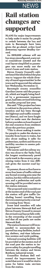 - November - "Rail station changes are supported" reports the North Devon Gazette, on the 19th, following Devon County Council Cabinet approval on the 12th of the revised Barnstaple Rail Station Bus Integration Enhancements scheme. The North Devon Highways and Traffic Orders Committee had previously requested Cabinet to approve the proposals, on 10th October (see below).