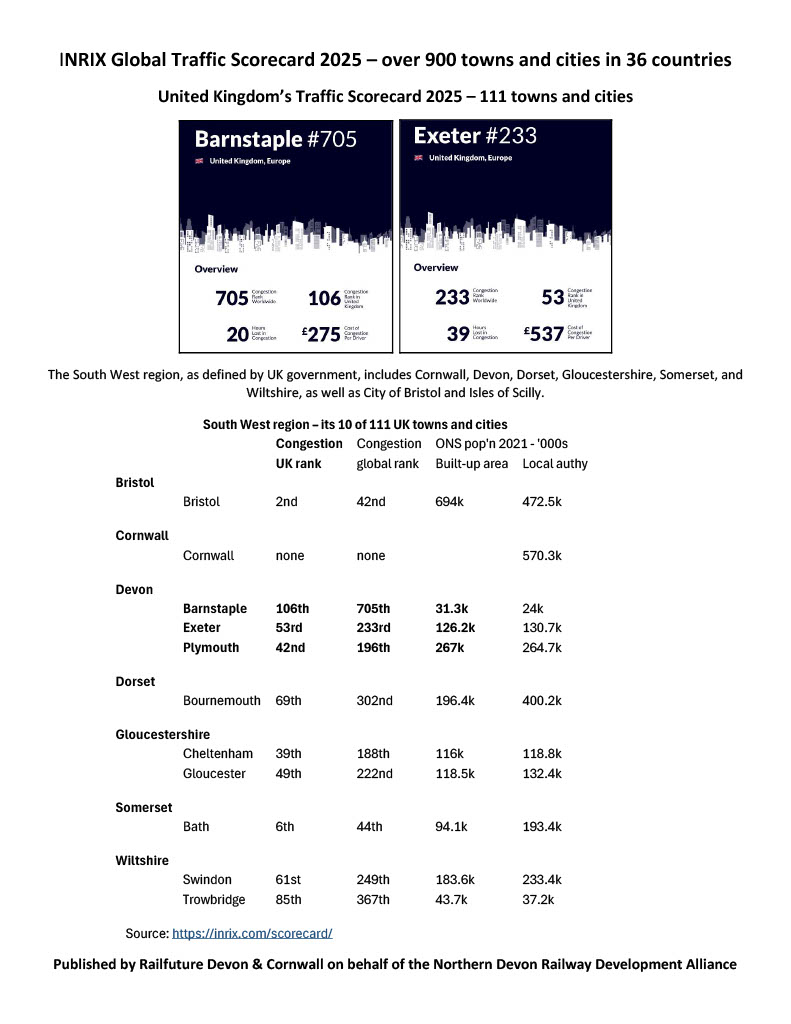 - December - the 10 most-congested towns and cities in the South West region include Barnstaple and Exeter in Traffic Scorecard 2025, published by Railfuture Devon & Cornwall on behalf of the Northern Devon Railway Development Alliance on the 2nd.