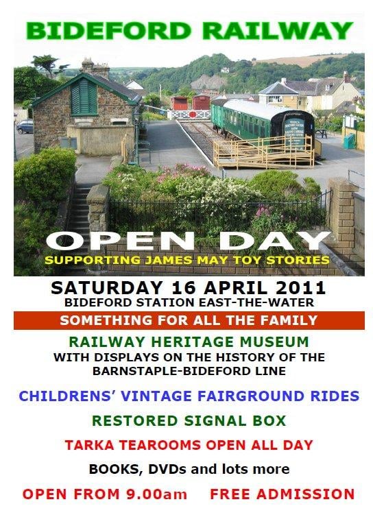 - April - 15th anniversary of most recent Barnstaple-Bideford train, the successful James May Toy Story running a 1:76 scale train from Barnstaple station into Bideford Railway Heritage Centre's Open Day, on the 16th.