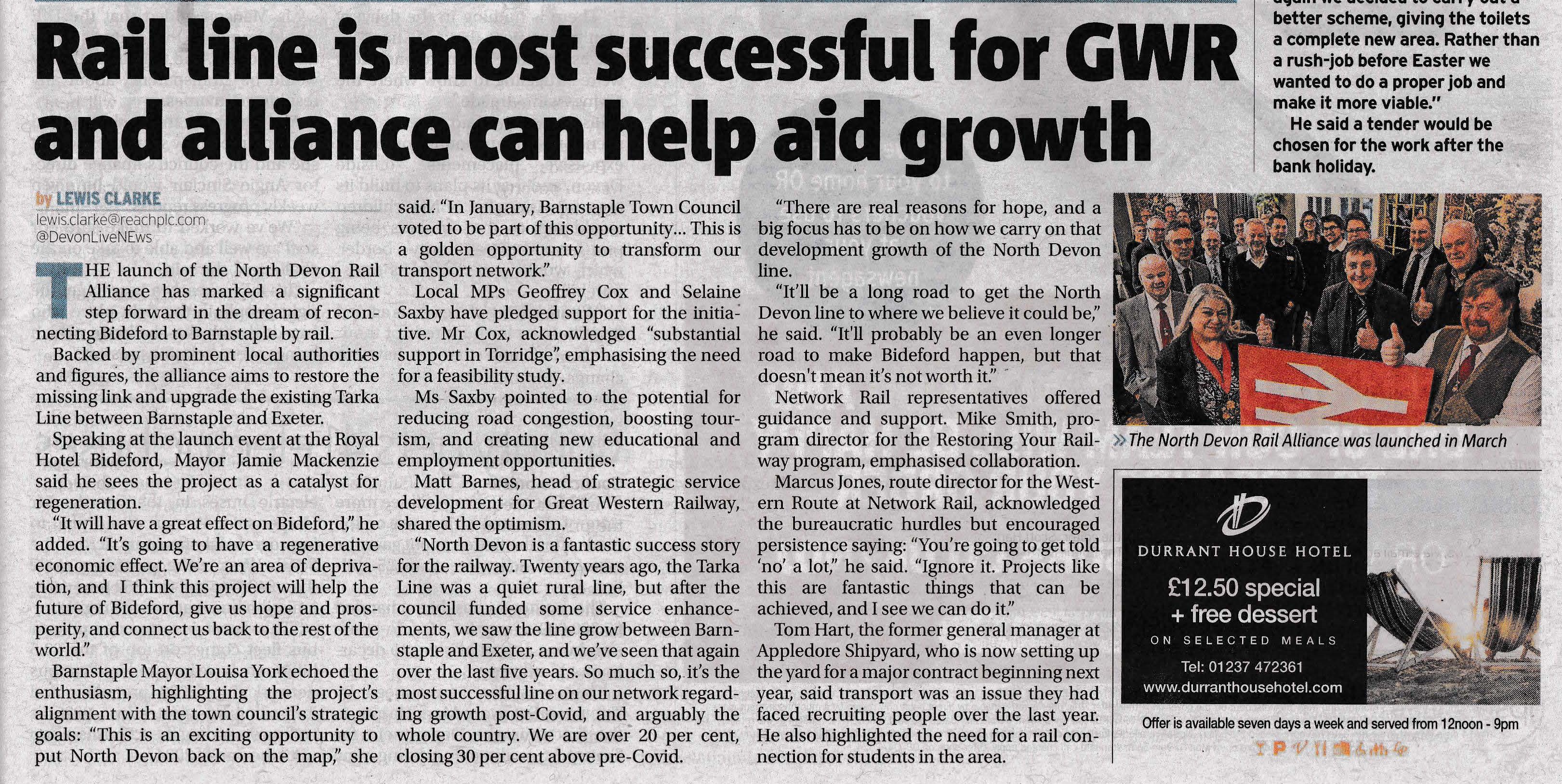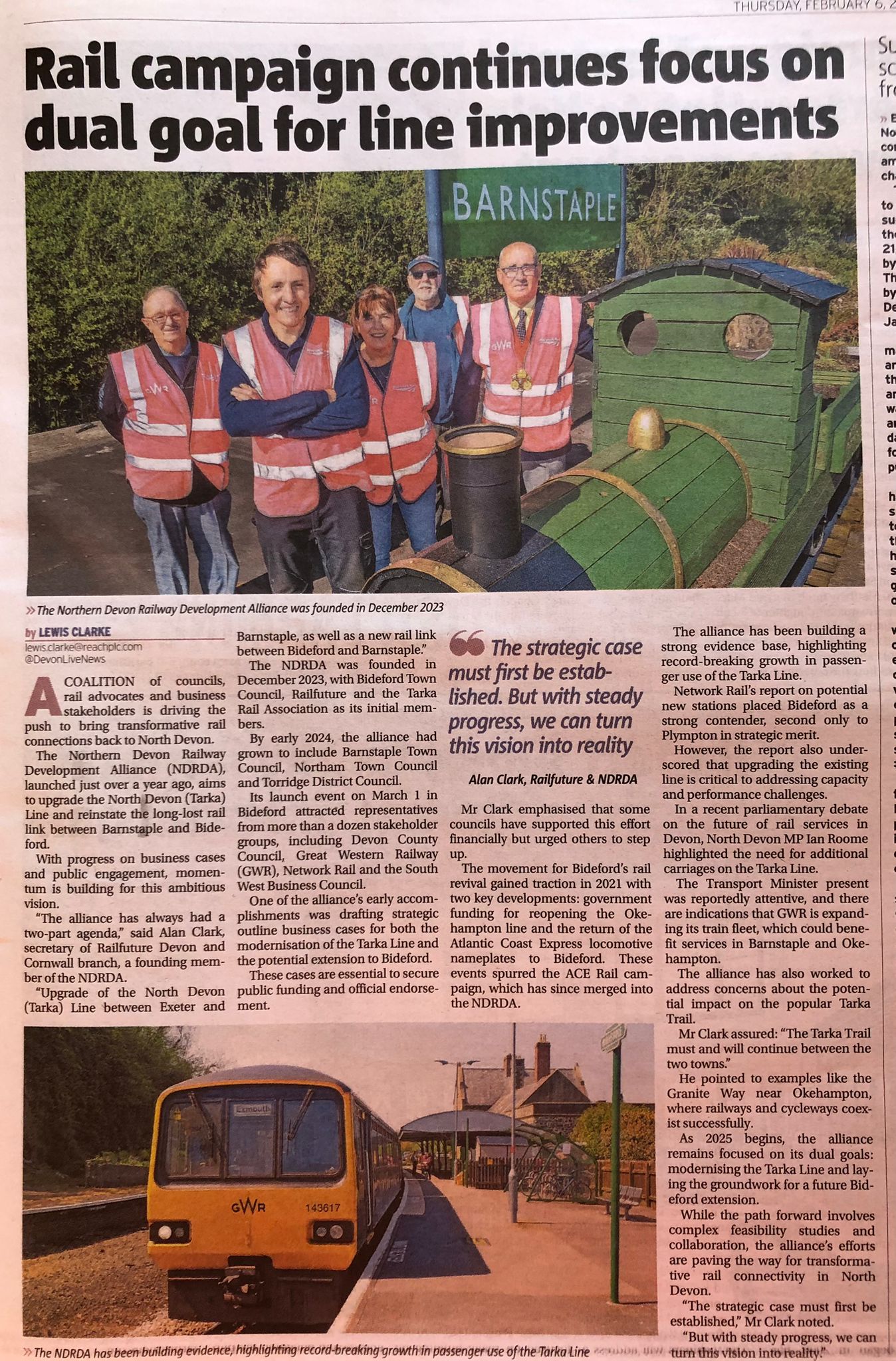 "Support for rail link plan gathers pace - Proposed line would connect towns" declares the front page, while inside "Proposals for new rail line to link towns wins support" reporting continues for the new Northern Devon Railway Development Alliance and its inaugural event on 1st March organised by Railfuture.