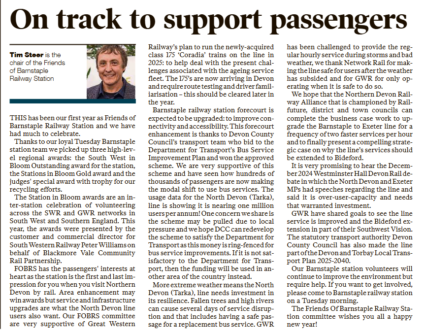 "Expansion on agenda as rail campaigners plan for 2026 Local transport champion" - Tim Steer (Railfuture's Devon & Cornwall regional branch chair) looks back and ahead to plot future for passengers.