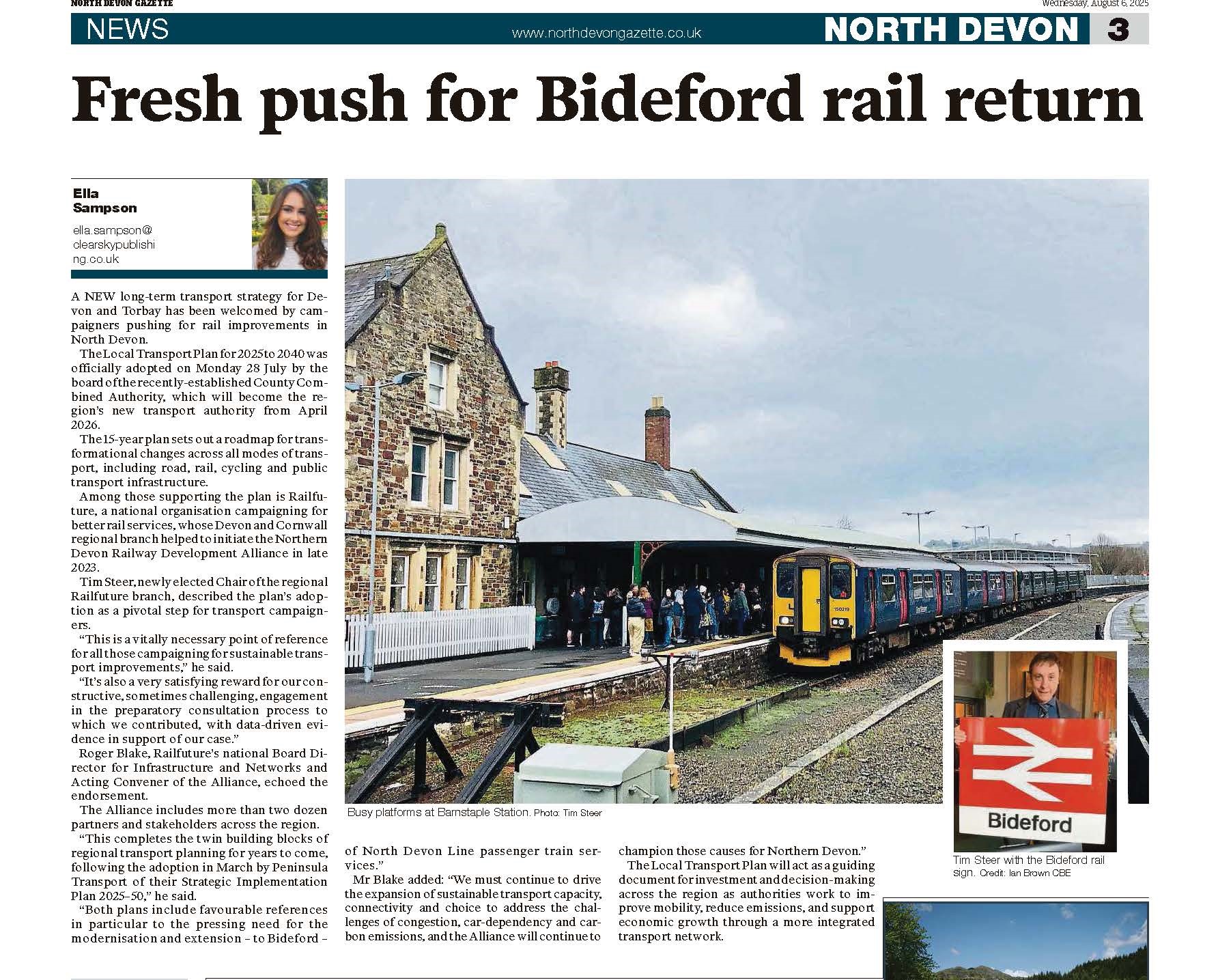 "New North Devon Railway Development Alliance is formed" - our press release about the inauguration of the Northern Devon Railway Development Alliance is picked up.