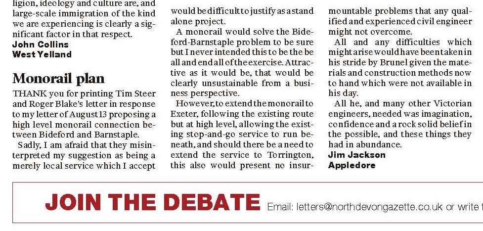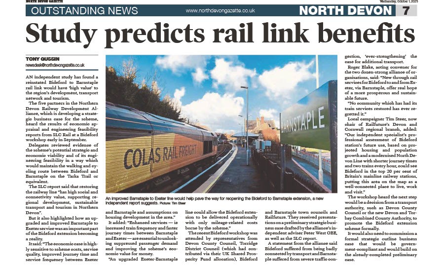 "Major step forward in creation of new Devon rail link" - the third newspaper to pick up on our press release about the launch of the Northern Devon Railway Development Alliance.