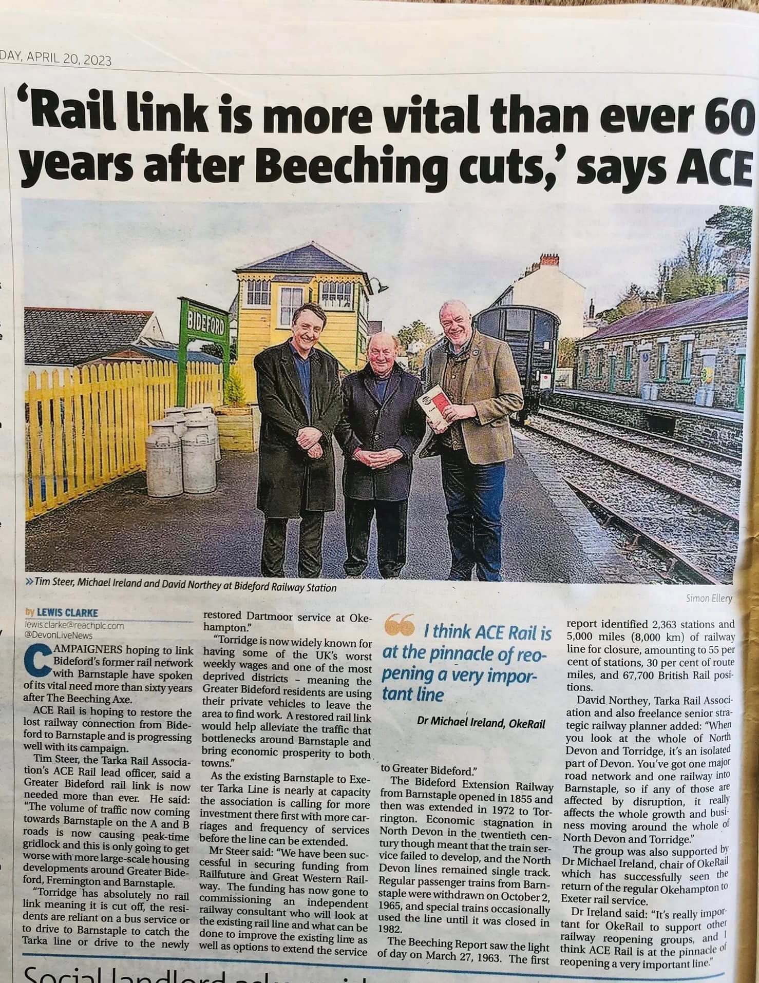 Rail link is "needed now more than ever" says front page headline. Inside headline: "Rail link is more vital than ever 60 years after Beeching cuts" says ACE over report which includes "Mr Steer said: "We have been successful in securing funding from Railfuture and Great Western Railway. The funding has now gone to commissioning an independent railway consultant who will look at the existing rail line and what can be done to improve the existing line as well as options to extend the service to Greater Bideford"" - see full story here.