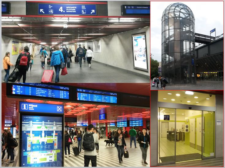 All of the platforms are connected via two underpasses – one at each end. The main underpass is spacious and easily able to cope with a trainload of passengers with luggage and leads to a modern extension to the station that has a massive concourse with a large number of retail outlets, restaurants, car hire and several ticket offices including one for arranging student travel. There are modern accessible toilets (see bottom right-hand corner of photo below), although these need to be paid for (either Czech Koruna or Euro coins – the latter works out more expensive) – perhaps using a contactless payment card will be possible one day. The station extension has multiple levels and the top deck is a car park. A spiral staircase (and lift) takes passengers to the ground floor.