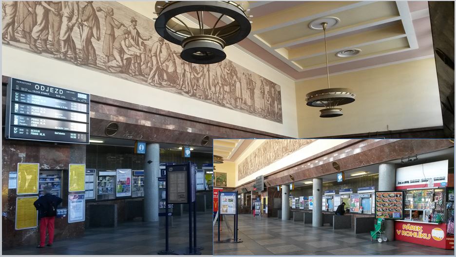 Prague Smíchov station (shown below) has retained its original design features (with communist imagery) and is clean, welcoming and fit for purpose. It has a modern destination screen, plenty of information, several ticket office windows and refreshments. There is a metro station below, so metro-rail interchange does not involve going outside. There are bus stops immediately outside (passengers are protected from the rain) and the tram stop is in the middle of the road outside. The station building viewed from the outside is far less appealing.