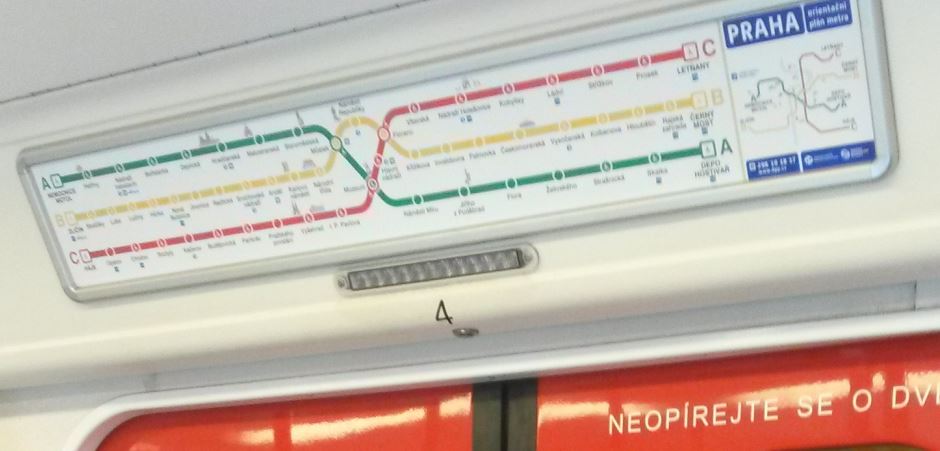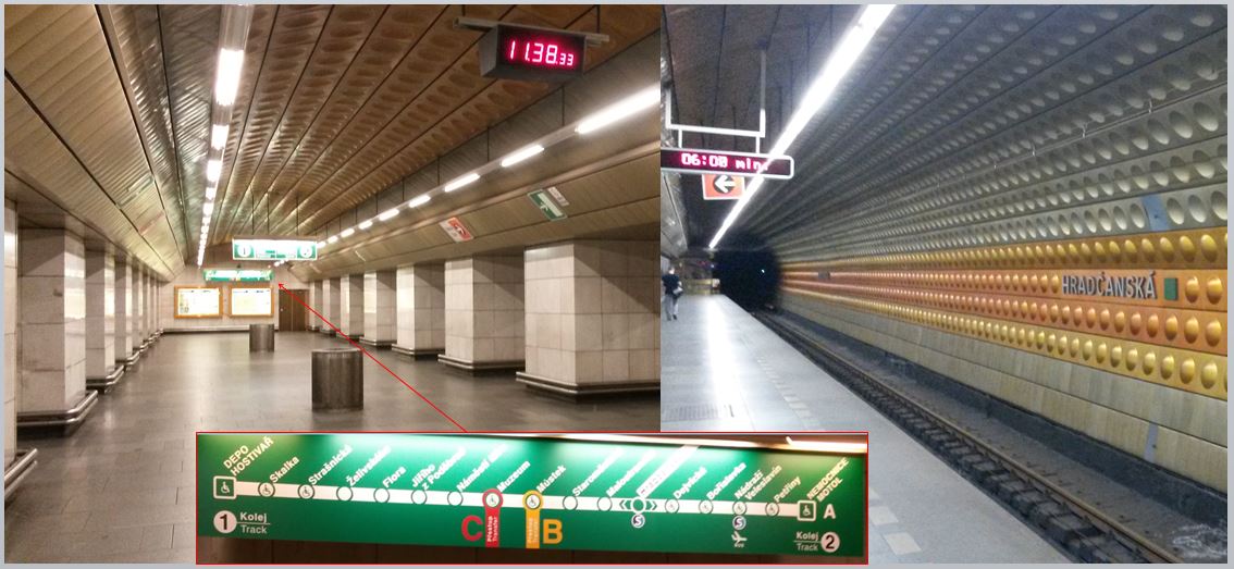 Of course, appearance is not everything. When descending to platform level at Hradčanská metro station there is a natural instinct at the foot of the escalators to turn left or right onto the platform (which also has a wall of golden and silver ‘dalek’ blobs). Astonishingly there is no information at all (apart from the station name), so the first-time passenger has no idea which platform to use for their destination. They have to leave the platform and continue walking to the very end of the corridor where there is a map on the wall. One just has to assume (correctly as it happens) that the 11 stations on the left of the sign require the platform on the left, and the five on the right require the other platform.