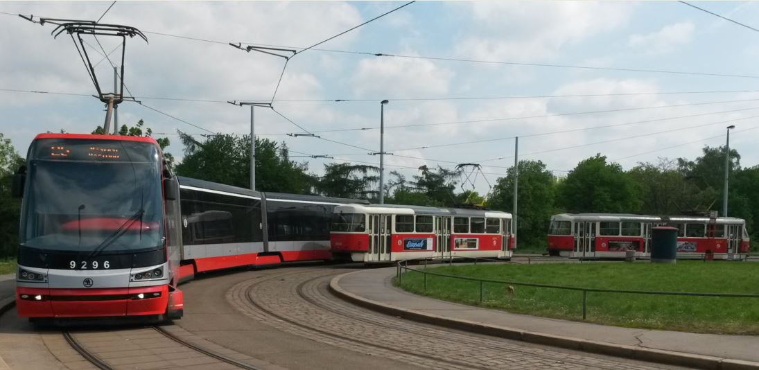 Like nearby Vienna and Bratislava along with some other European countries, there is only a driver’s cab at the front end of the tram (allowing space at the rear of the tram to be used by passengers) and there are only doors on the right hand-side, which means that there are seats on the left hand side all the way along the tram. Whilst unidirectional trams maximise productive space and therefore improve the economics of operation it incurs the additional cost of constructing a loop at the end of every line (in order to have a ‘go anywhere’ fleet) and loops along the route for turn-backs in order to get the flexibility needed. Although the use of a loop avoids the lost time of a driver having to switch off the tram, walk the length of the tram and then turn everything back on again, this only matters if a quick turnaround is diagrammed and that only tends to happen on fully segregated systems where journey time is consistent. In Prague short turnarounds are not the case. The terminus loops are long and have multiple tracks so that at least six trams can be stabled there (as shown it the photo below, which features old-style trams along with the new Skoda 15T low-floor trams introduced in 2010). Interestingly the system was not originally designed for unidirectional trams and the loops were added in the 1920s.
