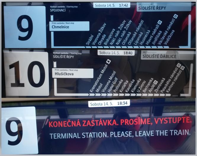 One of the good features of the latest trams is the on-board passenger information screens. They show the current date and time plus a moving list of tram stops on the route, with origin, next stop, 14 stops after that and final destination included. Request stops are clearly identified by a bell symbol. Interchanges with metro stations show the cleverly designed “M” with an arrow symbol. They do not show interchanges with other tram lines and there is no indication of arrival times though. They layout is easy to understand and could be copied by any city’s tram (or bus) service.