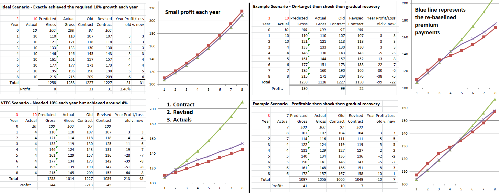 The graph below (click to view in full size) shows various scenarios, the first two modelling the VTEC scenario where it needed 10% growth, one showing success (3% profit margin each year) and the other the spectacular losses when it only achieved 4% growth. The other two scenarios both show a franchise hit by a shock part-way through, one having exceeded expectations in the first years, and the other had merely been on target. Both manage to recover towards the end of the franchise thanks to the new re-baselined premium payments.