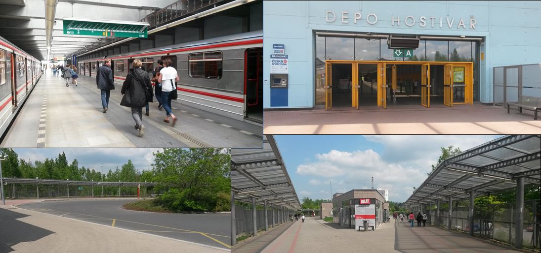 Depo Hostivař (shown in the photos below) is the terminus of Metro Line A. It is interesting that a metro station has been built within the compound of a metro depot, but the most astonishing thing is how the passenger experience is treated seriously. It requires a 250-metre walk from the metro entrance to the bus interchange, where there is also a car park, kiss and ride and taxi ranks. For the entirety of that walk there is a continuous canopy. It is possible to walk from metro carriage to bus without getting wet at all – sadly something that Britain’s fragmented transport system, where each mode is provided by a different operator, seems to make impossible.